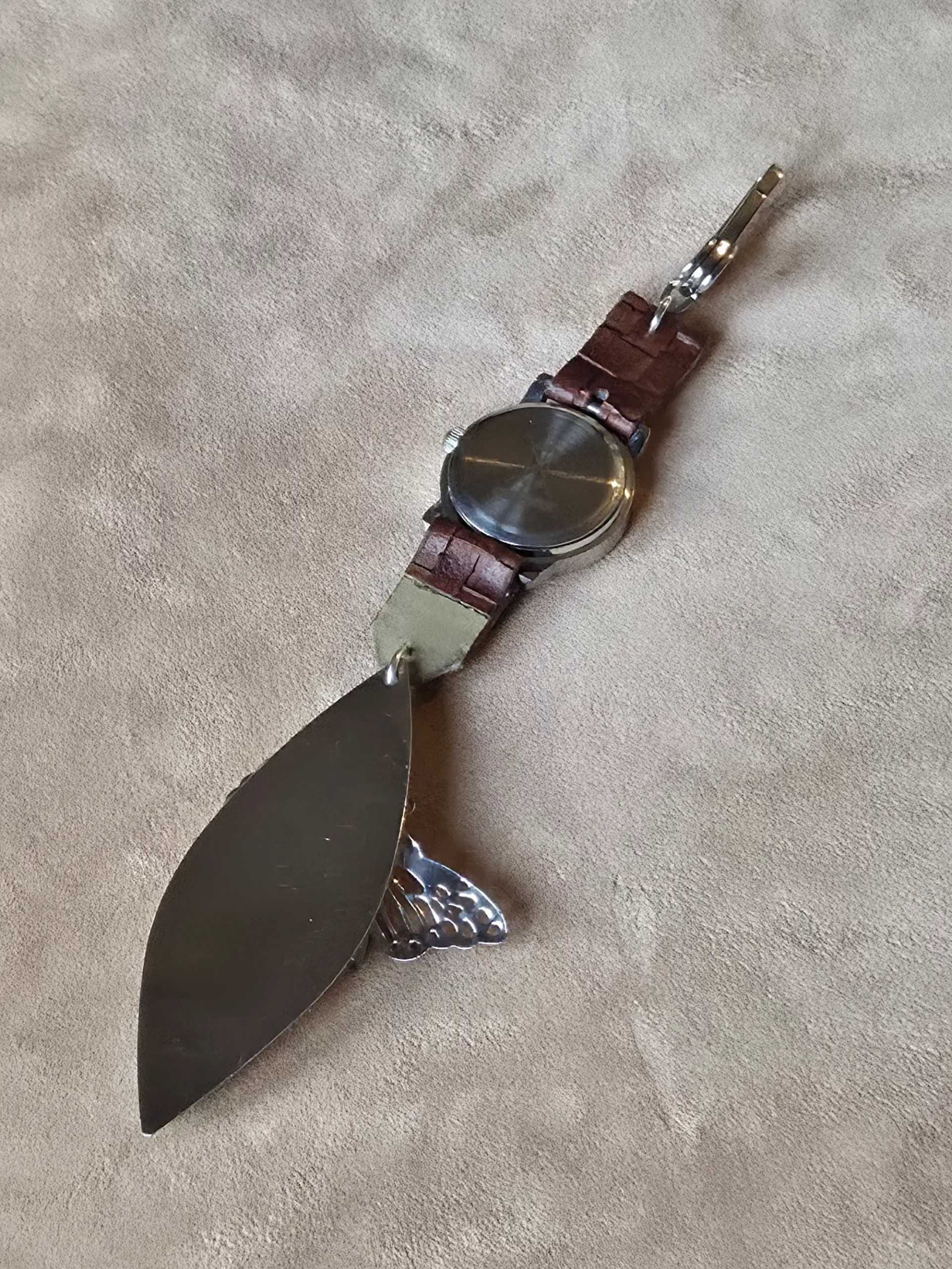 Réalisé à partir d’une montre vintage ronde en métal, chinée en brocante, et associée à des éléments de boucles d’oreilles argentées des années 1990–2000, il offre une seconde vie à des objets simples mais porteurs de sens.