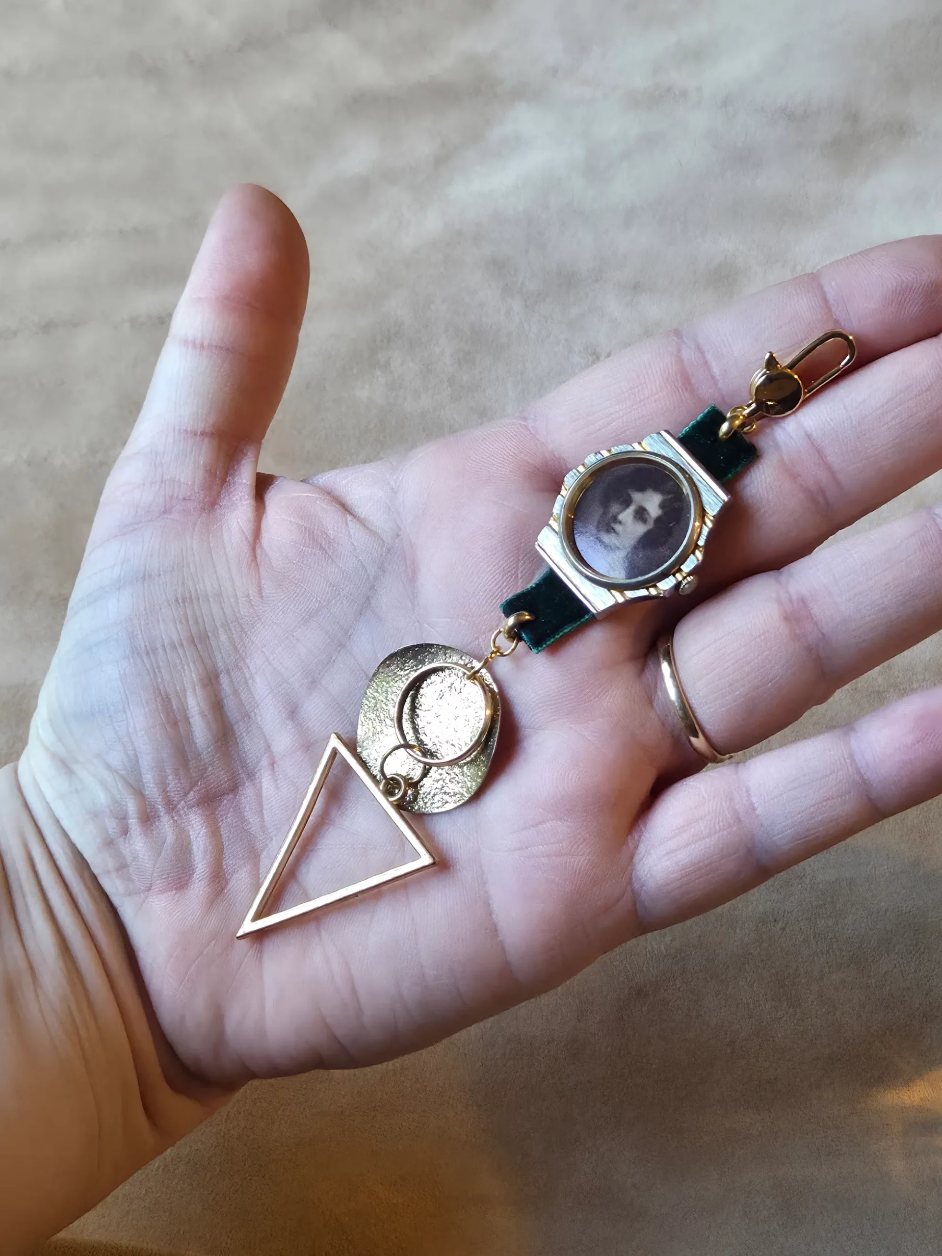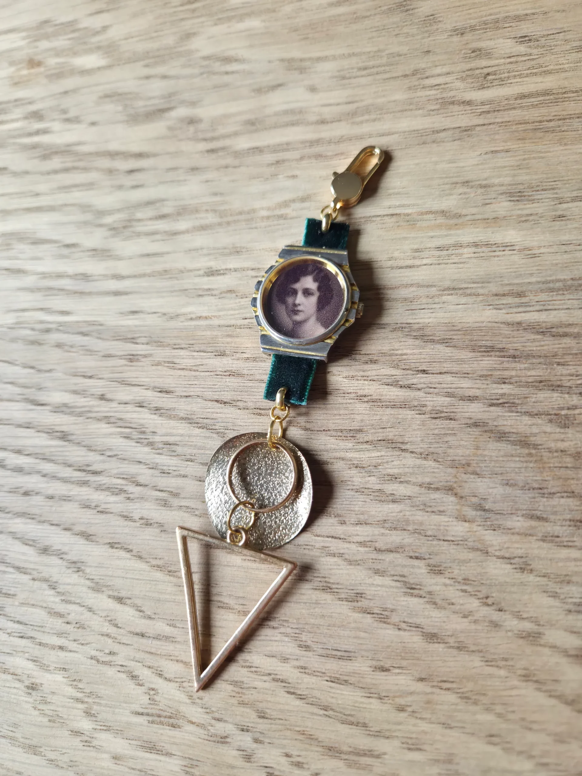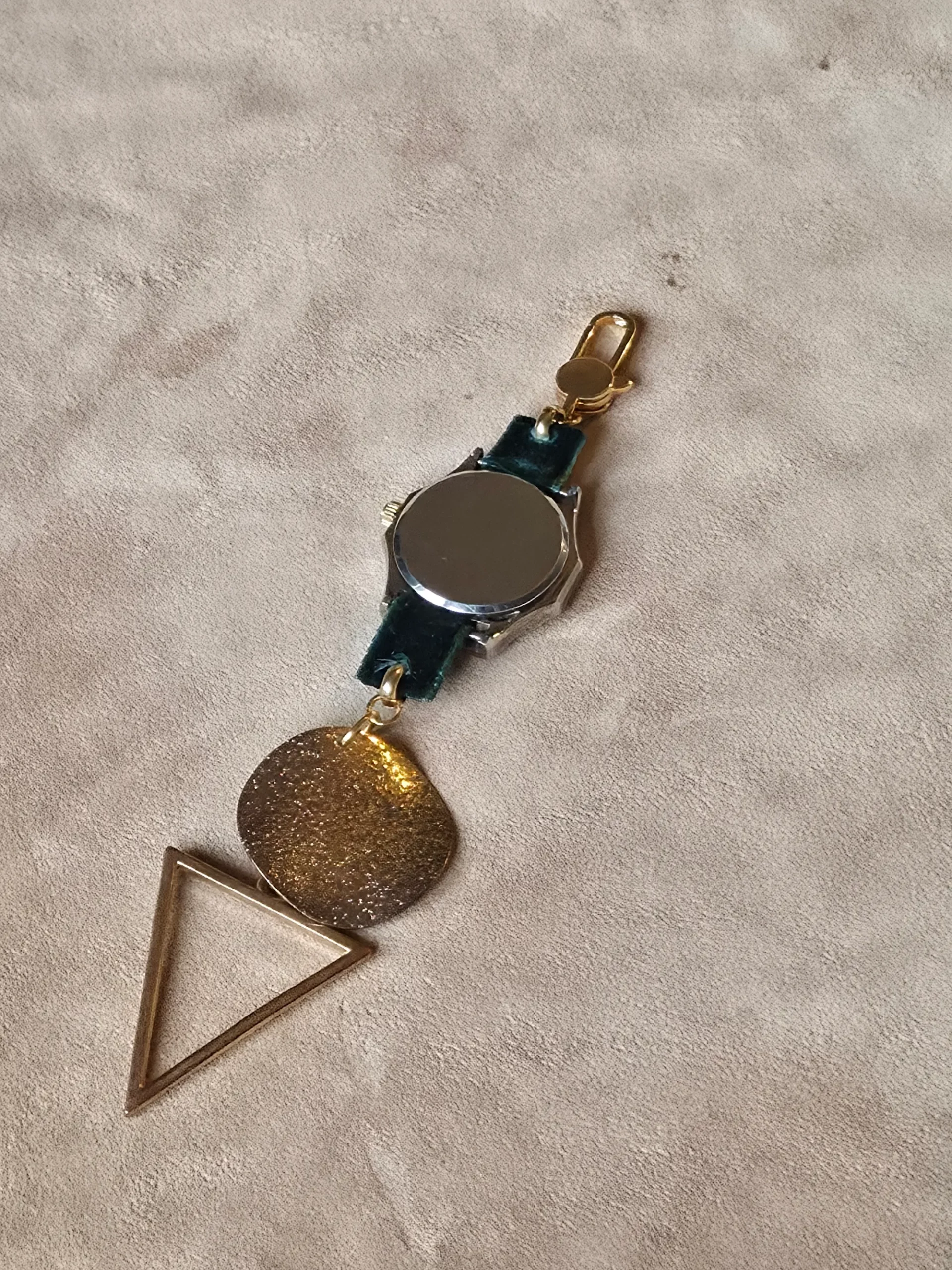 Bijou de présence n°12, délicat et graphique, réalisé à partir d’une montre quartz vintage des années 1980–1990 et d’éléments anciens.